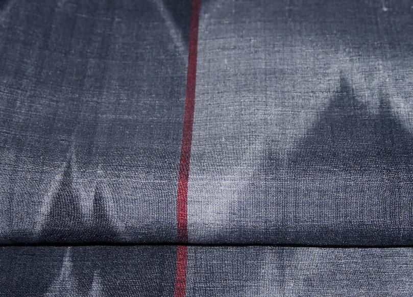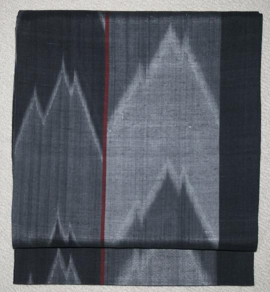 灰青色小千谷紬、稲妻松皮文様の全通(端から端まで通し模様)の袋帯です