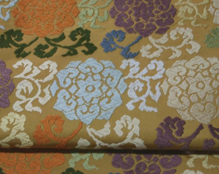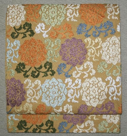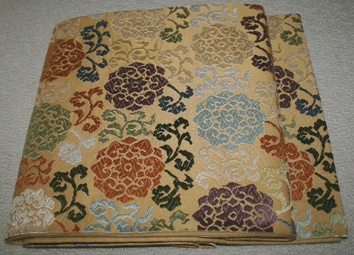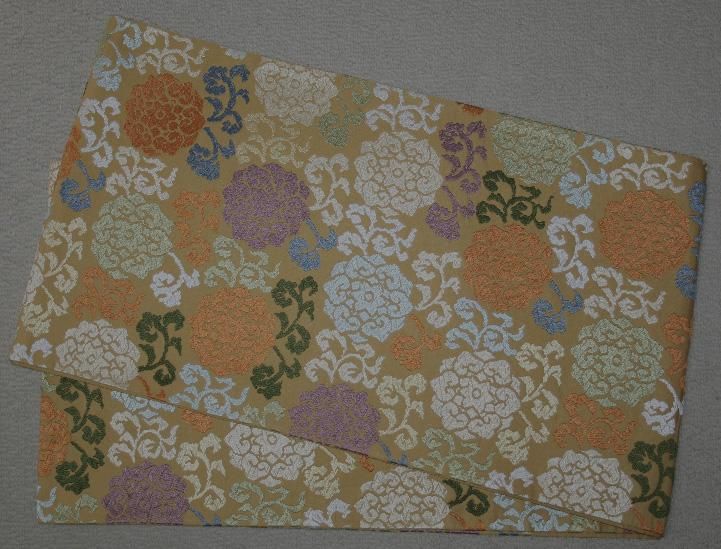 イエローオーカー色牡丹唐草文様の唐織袋帯です