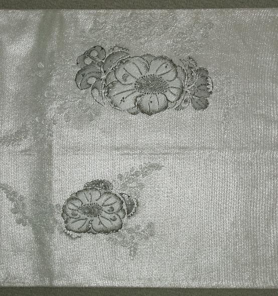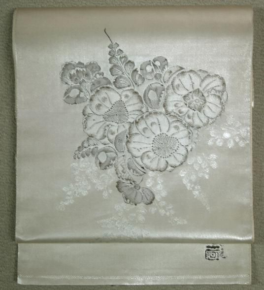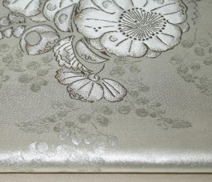 白銀引箔地に辻が花模様の、しなやヵで締めやすい地風の袋帯です