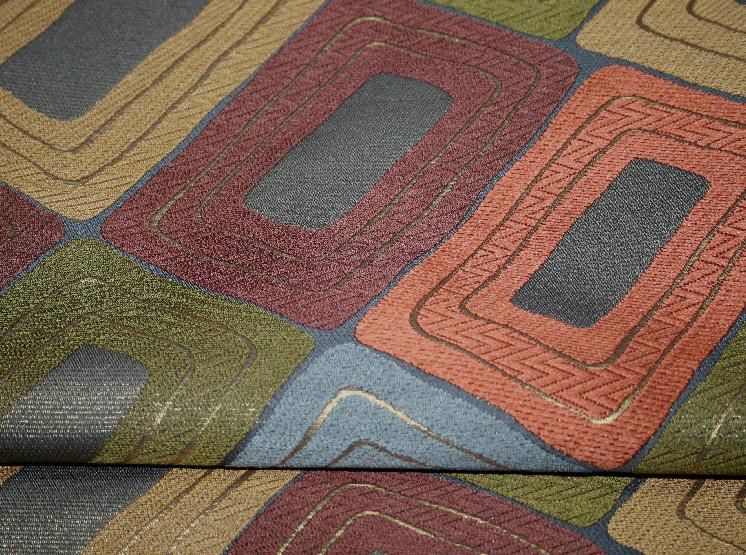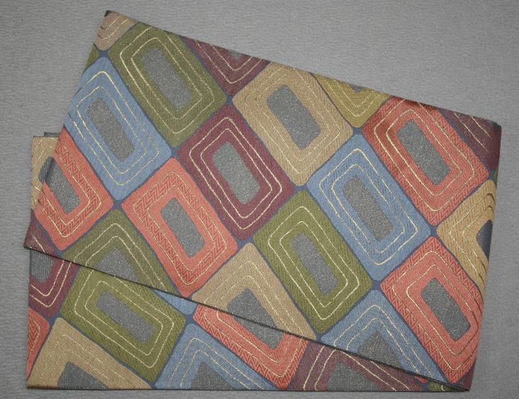 シックな岩井茶色地、カラフルな色使いで、幾何学模様を織った