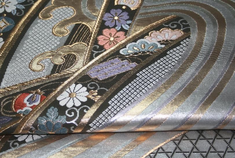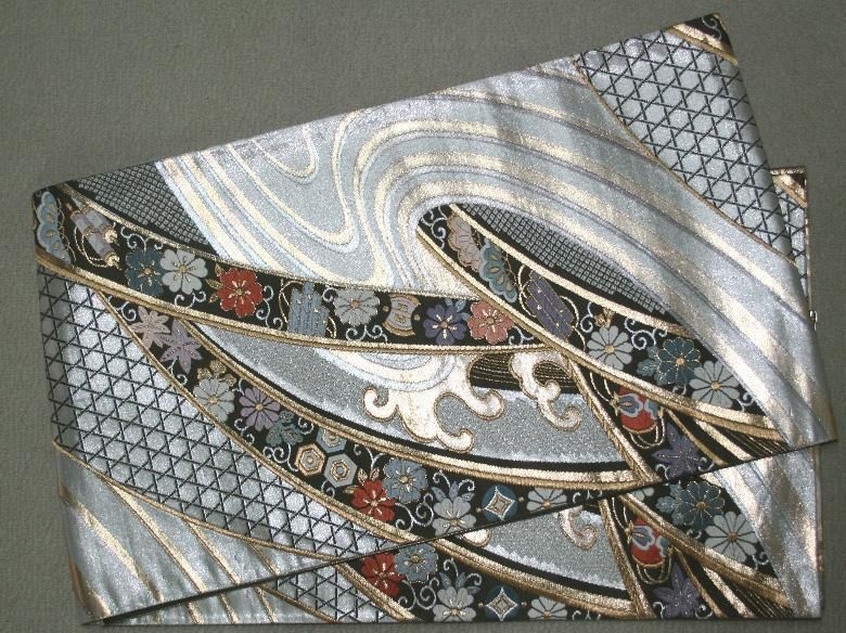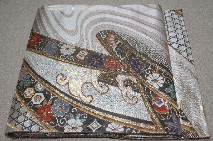 白銀地、伸びやかな熨斗に波濤文様の六通(通し模様)袋帯です